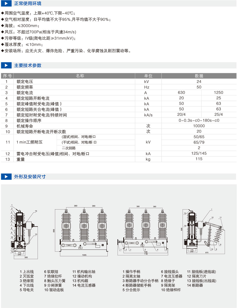 斷路器符合GB1984-2003《高壓交流斷路器》和DL/T402-2007《高壓交流斷路器訂貨技術條件》和DL/T403-200012kV ~ 40.5kV高壓真空斷路器訂貨技術條件》等技術标準。